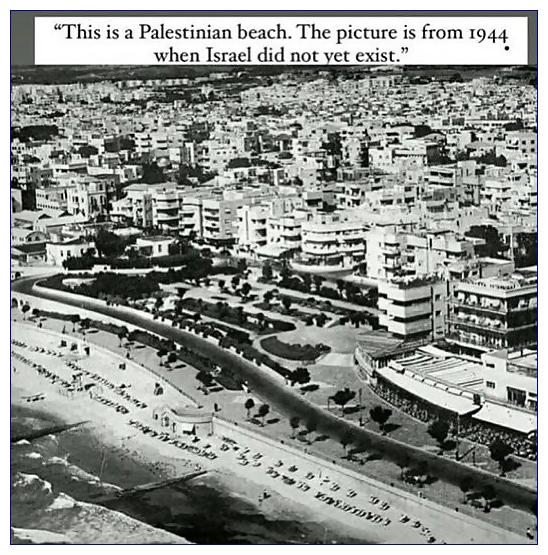 2. Fotografie vlevo není žádná palestinská pláž, ale pochází z raných dnů Tel Avivu. Ve první polovině 40. let bylo 95% obyvatel Tel Avivu židovského původu, kteří budovy na obrázku vybudovali.