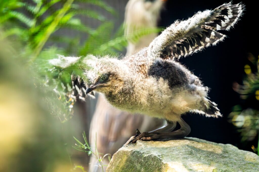 Dne 10. července 2025 se vylíhlo jedno mládě, dvě zbývající vejce byla neoplozená. O mladě pečují také oba rodiče. Krmí je různými druhy hmyzu (např. cvrčky, larvami potemníků), myšími holaty, drobnými hlodavci a později také kuřaty. »Zajímavostí je, že mezi preferované složky potravy patří oddělené ocasy (kaudální části) myší a potkanů. Ty pravděpodobně připomínají seriemám hady, kteří tvoří běžnou součást jejich jídelníčku ve volné přírodě,« dodává Zimmermanová. Mládě prospívá a rychle roste. Přibližně po měsíci opustilo hnízdo a nyní se již začíná samostatně pohybovat po voliéře. Stále je však rodiči střeženo.