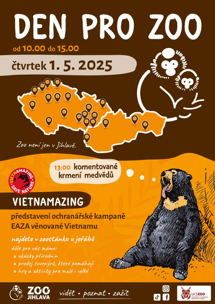 »Ve čtvrtek 1. května 2025 srdečně zveme všechny návštěvníky na Den pro zoo, který proběhne od 10.00 do 15.00 a ponese se v duchu exotického Vietnamu. Akce nese název VIETNAMAZING a jejím hlavním cílem je přiblížit veřejnosti aktuální ochranářskou kampaň EAZA zaměřenou na tuto výjimečnou oblast jihovýchodní Asie,« uvádí jihlavská zoo v tiskové zprávě.