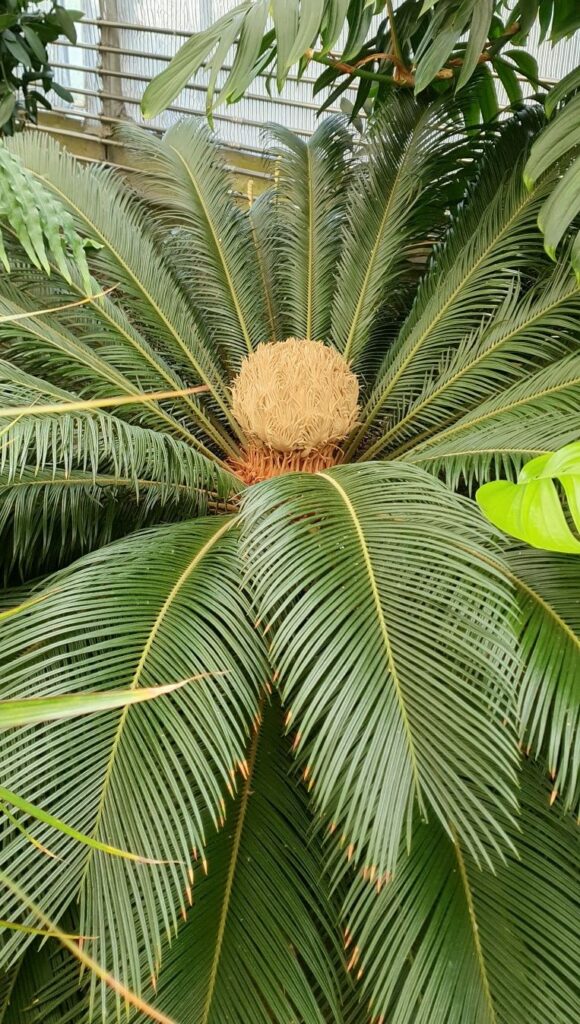 Přestože tak vypadá, o palmu se nejedná. Jde o cykas japonský patřící spolu s jinany a jehličnany mezi nahosemenné rostliny. V Zoo Ostrava mají tuto starobylou rostlinu v tropickém skleníku, kde ji mohou zájemci obdivovat při víkendových komentovaných prohlídkách. A že je co obdivovat! Cykas zde právě kvete, což se děje poměrně zřídka, obvykle pro mnoha desítkách let.