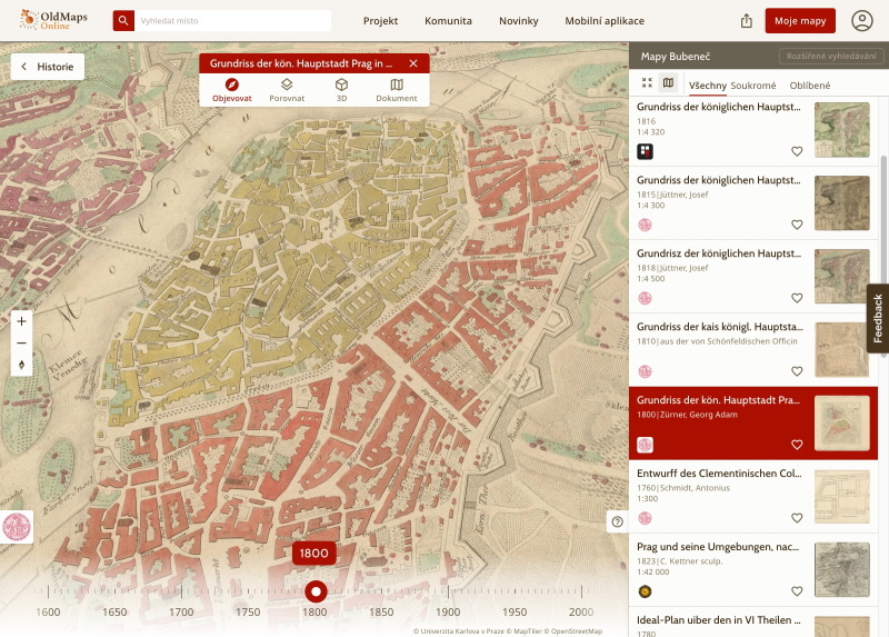 Mapa je součástí portálu OldMapsOnline.org – největší online knihovny historických map na světě, do níž je zapojeno více než 70 mezinárodních institucí, včetně mnoha českých knihoven, Britské knihovny nebo univerzitních knihoven a archivů evropských států. Uživatelé si mohou porovnat detailní staré mapy s moderními satelitními snímky, zobrazit vývoj měst a krajiny v čase nebo využít pokročilé vyhledávání podle lokality a období. Aplikace je dostupná i pro mobilní zařízení a podporuje 3D zobrazení i rozšířenou virtuální realitou.