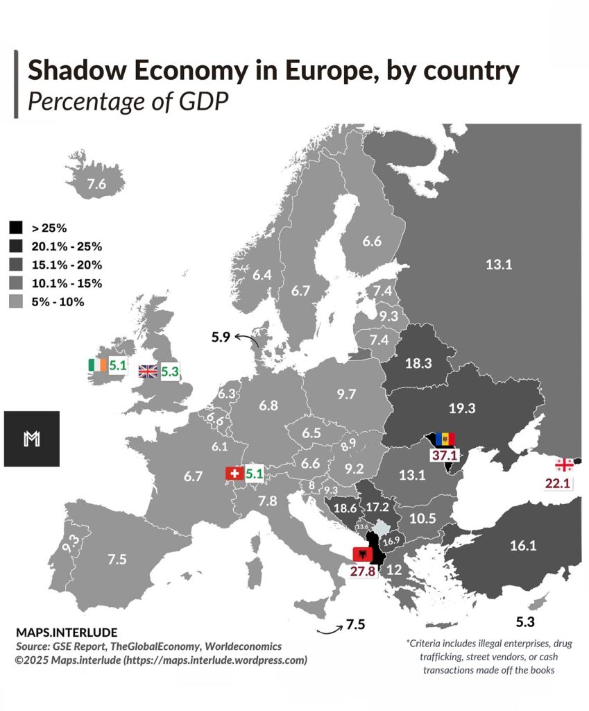 Webové stránky Map.Interlude zveřejnily mapu Evropy s uvedením podílu šedé ekonomiky v jednotlivých zemích. Data jsou převzata ze zprávy GSE, The Global Economy a World Economics.